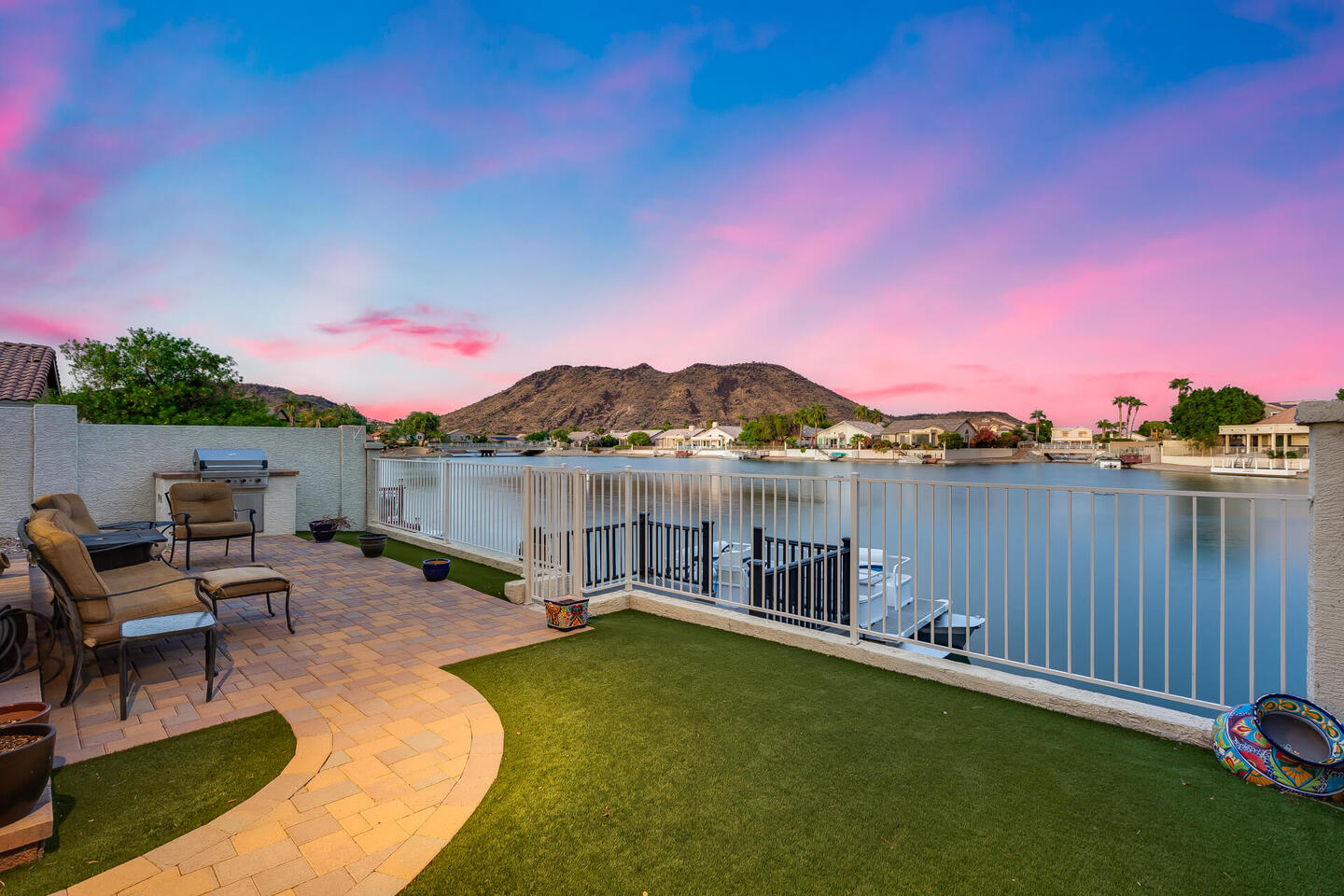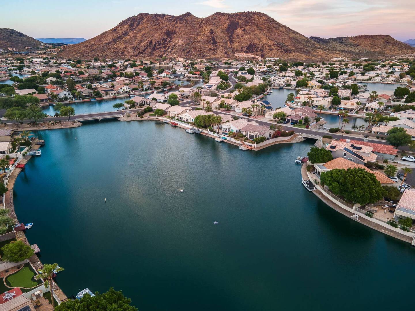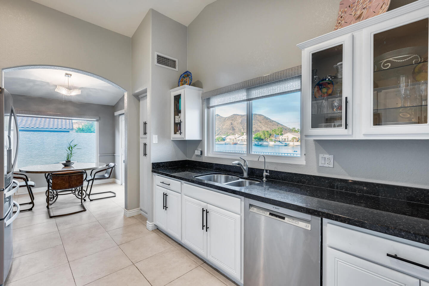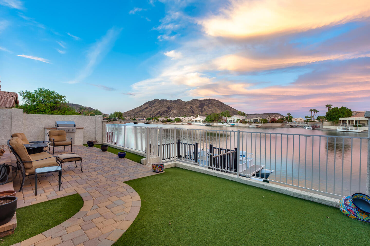 Perfect rare location with East facing backyard, Single level, truly updated home facing the wide mouth lake with 3 fountains and mountain views, on the longest lake in Arrowhead Lakes, just spectacular! Too many upgrades to list! New A/C & water heater in 2018, New roof being installed. New dock and pavered landscape in 2023, updated Kitchen and Baths. New windows throughout in 2019 with a new Patio door! Whole house water filtration system in 2020, new view fence. New epoxy garage floor with new a/c split and insulated garage door.
